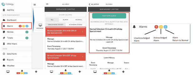 Alarms are push notifications that will announce audibly on the device if notifications are enabled. Users can view alarm detail, acknowledge and clear alarms from the app directly.