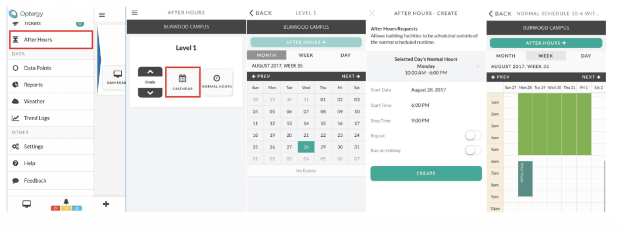 Using the Optergy after hours override feature, the mobile app can trigger an after hours override event on the fly in 30 minute increments, or scheduled up to a prescribed number of days in advance.